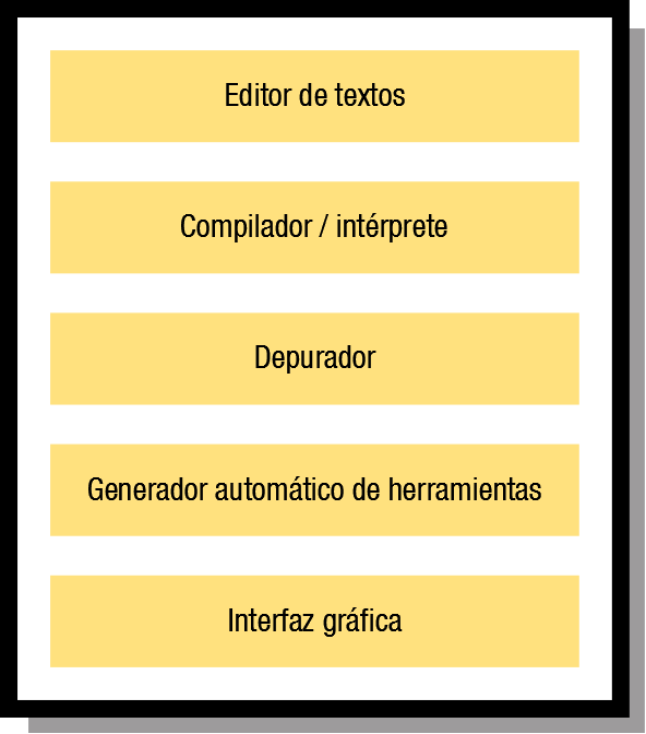 Juan aprendió a programar utilizando un editor de textos, un compilador y un depurador. Todas estas herramientas se instalaban de forma independiente. A Ana le cuesta creer que los programadores tuvieran que buscar estas herramientas e instalarlas por separado. –En un entorno se integran todas estas cosas y muchas más, y sin salir del mismo puedes programar en varios lenguajes y puedes documentar y…. —Ya lo veo, —le replica Juan—.¿Cuántos componentes tiene el entorno en total?