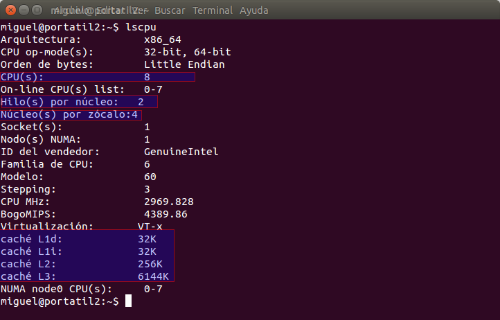 Si tenemos Linux instalado, el comando lscpu devuelve las características de la cpu