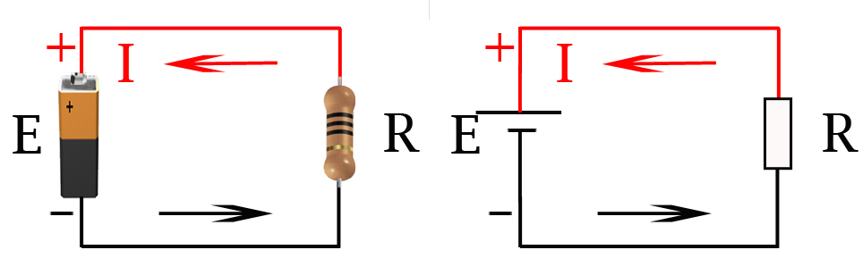En la imagen tenemos un circuito eléctrico real compuesto por una fuente de fuerza electromotriz (FEM), representada por una pila; un flujo de corriente (I) y una resistencia o carga eléctrica (R). Y en paralelo el mismo circuito eléctrico representado de forma esquemática.
