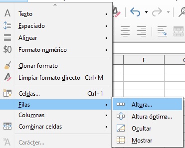 Por defecto las celdas de nuestras hojas de cálculo presentan unas características predeterminadas en cuanto al ancho y alto de las filas y columnas. Sin embargo, estas características se pueden modificar en función de las necesidades de cada hoja. Es posible hacerlo, como se explicó al principio de la unidad, situando el ratón entre dos filas o dos columnas, y ampliar su tamaño de modo gráfico, o desde FORMATO → Fila o FORMATO → Columna, presentando las opciones que se observan en esta imagen.