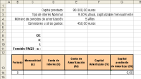 4º. Confecciona la línea correspondiente al segundo periodo. El valor de cada celda lo obtenemos a partir de los datos calculados con anterioridad. De tal manera que copiando esta línea hacia abajo, completamos el cuadro.