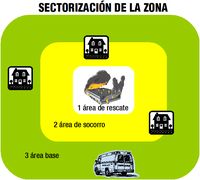 Las tres zonas antes mencionadas se van a ir situando de manera limítrofe desde el lugar donde se ha producido la catástrofe, el punto de impacto, hacia el exterior. Cada área estará perfectamente delimitada, y cada equipo trabajará en una de ellas.